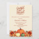 Um fundo bege suave. Decorado com abóboras e flores laranja e amarelas. Personalize e adicione os detalhes da festa. Script de texto: Grateful e abençoado.