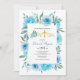 Flores de aquarela azul, batismo, convite floral. Este belo design apresenta um quadro floral feito de flores azuis e folhas suculentas e seu texto. A palavra "batismo" encontra-se em ouro, numa letra decorativa, com um buquê floral, enquanto o nome do rapaz se encontra na tipografia da escrita. Em vez da letra "I" na palavra "Batismo, há uma cruz dourada.