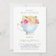 Junte-se a nós para uma festa de chá! Convide familiares e amigos para o seu evento com este convite de chá de fraldas personalizável. Apresenta a ilustração aquarela de uma equipe com um buquê rosa. Personalize adicionando seus detalhes. Este convite para chás de fraldas florais é perfeito para eventos de primavera e jardim.