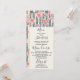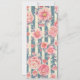 Cartão de menu com um belo padrão apresentando lindas flores cor-de-rosa sobrepostas a um padrão de listras composto por listras azuis e creme.