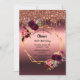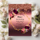 Na frente: um convite para uma festa de aniversário (ou qualquer idade) de 30. Um fundo metálico falso e cor-de-burro, com uma falso estrutura geométrica dourada. Decorados com flores roxas escuras e burgueiras, rosas e penas do estilo "boho". Lixiviação de bronze falsa. Modelos para um nome e detalhes da festa. O nome é escrito com um script de estilo manuscrito, letras pretas. Fundo: fundo de aparência metálica falsa e cor burgundy