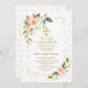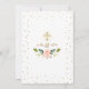 Design de cartão elegante com flores de coral vivas e folhas verdes, cor d'água, forma quebrada de brilho fino e confete, cruz de ouro brilhante, sobre fundo branco. Nas flores traseiras, divisor floral buquê, cruz dourada, iniciais, moldura de confete dourado, sobre fundo branco. Use a ferramenta Personalizar para adicionar suas informações, alterar fontes, cores da fonte. Para encontrar itens, por favor, visite minha Santa Coleção de Comunhão.