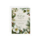 Traga elegância eterno aos seus cartões de natal com este design de Natal verde e branco. Apresentando flores de inverno, galhos de pinheiros verdes e sotaques naturais suaves, ele captura perfeitamente o charme pacífico da estação. A combinação de flores delicadas e verde rústico faz dela uma escolha refinada, mas acolhedora, para espalhar alegria festiva.