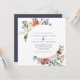 Um belo convite para colocar a cena para o seu casamento no inverno. Apresentando flores festivas de aquarela em branco, cor-de-rosa, verde e marinho atrás de um quadro circular, em conjunto com sofisticado texto azul marinho e fundo sólido.