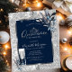 Dourado brilho ombre, vidro de champanhe, pérolas, tiara e flores de inverno sobre fundo azul marinho.