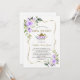 Design de cartão elegante com flores lavandas e folhas verdes, divisores florais, bule de dourado falso com flores, sobre fundo branco. No verso, buquê e iniciais de flores. Use a ferramenta Personalizar para adicionar suas informações, alterar fontes, cores da fonte. Para obter itens correspondentes, visite minha Coleção de Flores de Lavanda.