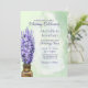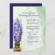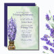 Este convite de casamento de aquarela apresenta um cheio vaso de lindos pedúnculos de flores de lavanda. São colocados contra um fundo verde pastel e uma mistura de lavandas. O texto e o verso do convite são uma lavanda escura.