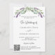 Um fundo branco decorado com flores lavandas e verde de eucalipto. Personalize e seus nomes e detalhes, adicione seu URL do site de casamento ao código QR para obter detalhes e/ou RSVP.