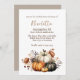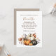 Este convite personalizado elegante apresenta um tema floral de outono com abóboras. Uma imagem aquarela de quatro abóboras de cores diferentes é colocada na parte inferior. Elas são acentuadas com um buquê de flores secas em belas cores de outono. É perfeito para um chá de noiva, festa de aniversário, casamento ou qualquer outra celebração aconchegante de outono.