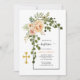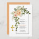 Pessegueiros de coral, flores de aquarela, verão de arco e convite batismo para garotas. Esta adorável design apresenta um arco com flores de cacto de pêssego e folhas verdes no canto superior esquerdo e uma cruz de ouro. A frase "batismo" está na tipografia da escrita.