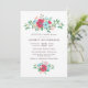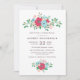 Um belo chá de panela floral com arranjos florescentes desenhados à mão em cor-de-rosa profundo e azul brilhante, com rosas e flor de cereja, e um adorável texto de convite castanho escuro. Convite perfeito para chás de panela primavera ou chás de panela de verão.