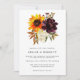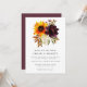Um bonito buquê de outono de um girassol amarelo, um púrpura e uma hidrangea branca estão no topo deste convite de casamento moderno. Faz parte da coleção Sunflower e Burgundy.