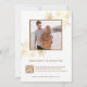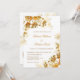 Este convite de casamento luxuoso e elegante apresenta flores douradas tridimensionais criadas por IA e flores de arte de linha dourada em um fundo branco. Com sua foto e um código QR escaneável para o site do seu casamento no verso. Nomes dos noivos em uma escrita elegante à mão.