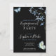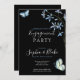 Flores e Borboletas | Convite à Festa de noivado Negra - Está à procura de um convite à festa de noivado bonito? Confira este Convite Preto que tem flores de primavera azuis e borboletas azuis e verdes. Este é um convite para festas de noivado de flores e borboletas bonito para uma festa de Primavera ou Verão. Personalize seu convite de festa de noivado com todos os seus detalhes, incluindo os nomes do casal, a data da festa, o local e informações sobre como RSVP e quem está jogando a festa!