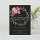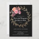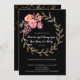 Um convite de festas de Véspera de ano novo com tema de flores e champanhe, com uma coroa floral cor-de-rosa rosa, a preto, com folhagem foliar. Um evento temático.