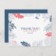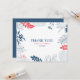 Flores e folhas tropicais enquadram em azul escuro, branco e vermelho coral sobre um fundo branco. Texto de agradecimento personalizável.