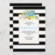 Bonito convite para a festa de noivado floral moderno e chic, com lindas flores e folhas azuis e amarelas, uma fronteira feita de listras negras e brancas e o seu texto em um quadro branco. O dorso está coberto com um padrão listrado em preto e branco.