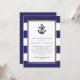 Esses convites de chás de casais, porém clássicos, apresentam uma âncora náutica azul marinho e um buquê de aquarela de peônias correspondentes em uma falso moldura de ouro. As faixas marinho e branca decoram a borda.