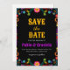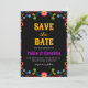 Celebre seu amor com este elegante e festivo, salve o cartão de data! Com um belo design floral inspirado no papel picado tradicional mexicano, este cartão é perfeito para um casamento de destino ou uma celebração temática de fiesta. O fundo preto cria um aspecto sofisticado e moderno, enquanto as cores vibrantes e os detalhes intrincados adicionam um toque de encanto tradicional.