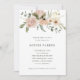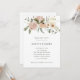 Este simples e elegante casamento ou chá de panela apresenta um buquê rústico de flores aquáticas e verde em tons neutros de pêssego, terracota e marfim, sobre fundo branco.