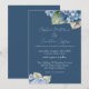 Este convite de casamento floral romântico apresenta hortênsias azuis em aquarela sobre um fundo azul marinho. Um delicado buquê de flores de hortênsia é retratado na parte superior e outro na parte inferior.