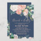 Este romântico floresce o brunch azul e o cartão de convite à borbulha é perfeito para um chá de panela elegante. O design floral apresenta flores brancas, cor-de-rosa-claro, cor de pêssego e branco em cascata, em um fundo azul-marinho.