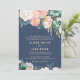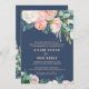 Este romântico cartão de convite formal de casamento de flor de pénia azul é perfeito para um casamento elegante. O design floral apresenta flores brancas, cor-de-rosa-claro, cor de pêssego e branco em cascata, em um fundo azul-marinho. Para mais opções de texto de convite para o casamento, consulte a coleção completa de casamentos das flores de pénia romântica: https://www.zazzle.com/collections/119651858051595378
