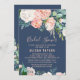 Este romântico cartão de chá de panela azul de flores de pénia é perfeito para um chá de panela elegante. O design floral apresenta flores brancas, cor-de-rosa-claro, cor de pêssego e branco em cascata, em um fundo azul-marinho.