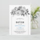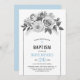 O convite floral de cinza de Watercolor rose. Mostra um buquê lindo de rosas e folhas, uma cruz e texto azuis e uma borda prateada. O dorso é de cor azul sólida.