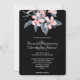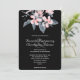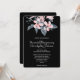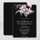 Um convite de casamento com uma bela ilustração em aquarela de flores rosa com folhas cinzas em um único caule. Um design botânico moderno e elegante. Fundo preto.
