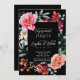 Flores rosa e vermelha | Convite à Festa de noivado Negra - Está à procura de um convite à festa de noivado floral bonito? Confira este Convite Preto que tem um quadro floral cor-de-rosa, laranja e branco com verde. Estas flores bonito estão armando as palavras, criando um tema de Primavera ou Verão bonito na sua papelaria de casamento. Personalize seu convite de festa de noivado com todos os seus detalhes, incluindo os nomes do casal, a data da festa, o local e informações sobre como RSVP e quem está jogando a festa!