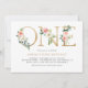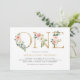 Aquarela Pêssego Flores Rosa Primeiro Convite de Aniversário | Convite para aniversários de criança coloridos e brancos, contendo letras falsas em folha de ouro com pêssego de cor d'água e flores de marfim e acentos verdes. Este convite floral é perfeito para aniversários de jardim e primavera. As cores também são perfeitas para os aniversários de primavera.
