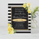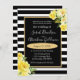 Este convite de casamento impressionante e impressionante apresenta riscas brancas e pretas arrojadas com uma trilha de ouro e flores amarelas. As rosas amarelas realmente pop e cantam maravilhosamente neste maravilhoso convite para o casamento.