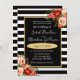 Este convite de casamento espetacular e impressionante apresenta riscas brancas e pretas em negros com uma trilha de ouro e flores rosa e vermelha. As rosas vermelhas rosa e papoilas realmente pop e cantam maravilhosamente neste maravilhoso convite para o casamento.