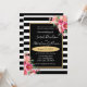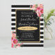 Este convite de casamento espetacular e impressionante apresenta riscas brancas e pretas com um trim de ouro e flores cor-de-rosa e embaçadas e fuschias. As flores e rosas realmente pop e cantam maravilhosamente neste maravilhoso convite para o casamento.