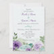 flores românticas, azuis e roxas, verdes folhas convite ao casamento