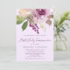 Estes adoráveis convites da Primeira Comunhão apresentam um buquê floral de cor d'água roxo com muitas folhas verdes sobre fundo de lavanda macio. Escrita manual roxa e texto moderno combinam-se para um aspecto simples e elegante e neutro em termos de gênero.