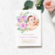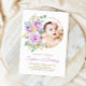Flores roxas, convite de nascimento de bebê, com folhas verdes de eucalipto e rosas de aquarelas roxas e ouro