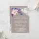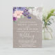Este cartão de casamento de flores roxas e rendas é perfeito para um casamento no campo. O design rústico apresenta um belo arranjo de flores roxas de ameixa, lilás e rosa-pincelado com rendas florais brancas sobre um fundo elegante de linho. Para obter mais opções de texto de convite para casamento, consulte a Coleção de Casamentos de Roxos e Locais completa: https://www.zazzle.com/collections/119140093140276216