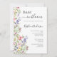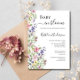 Um belo design de flor silvestre de aquarela, com flores púrpuras cor-de-rosa e flores silvestres amarelas, com um convite para chá de fraldas de libélula. Perfeito para seu chá de fraldas de meninas.