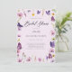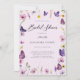 Um elegante chá de panela de vassoura com flores silvestres (cosmos e outras flores e gramíneas comuns) em aquarela, borboletas roxas e cor-de-rosa com borboletas douradas (são efeitos digitais, não folhas reais ou reluzentes!) e caligrafia moderna, com uma flor silvestre rosa no verso. Elegante e chic, é o convite perfeito para um almoço de noiva, brunch ou festa no jardim do quintal, ou para qualquer noiva que ame flores silvestres, borboletas e designs rústicas, de campo com um toque de amor romântico.