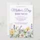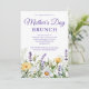 Um adorável convite para o Dia de as mães Brunch. O fundo apresenta flores de aquarela mistas e verde em branco. As cores principais são branco, verde, roxo e ouro amarelo. A cor da fonte está definida para corresponder à lavanda roxa.