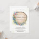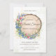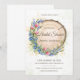 Watercolor Wildflower & Blueberry Rustic Chá de panela Card. O estilo romântico com mirtilos, flores lavandas, trevo e eucalipto é perfeito para um casamento de verão rústico. A base da composição é uma coroa de flores silvestres e um círculo de madeira. O sabre de aquarelas complementa a composição das flores e bagas e lhe dá um encanto especial.