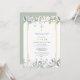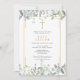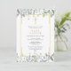Folhas bonitas de sálvia e lilás caem sobre uma moldura dourada elegante que envolve os detalhes do seu batismo ou batizado em texto clássico e elegante. Concebido por Thisisnotme©