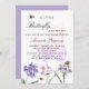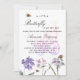 Um fundo branco. Decorados com uma borboleta grande, abelhas e flores silvestres pintadas em violeta e rosa. Personalize e adicione um nome e detalhes da parte.