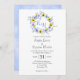 Girassóis e rosas azuis leves com vinhas verdes folha envoltas em uma luxuosa coroa de casamento. O trabalho de arte floral de aquarela é perfeito para casamentos de verão, outono e primavera. Rosas azuis claros são versáteis para paletas de cor azul-céu e azul-poeirento. As iniciais do casal no centro da coroa do casamento são bonitas com uma variedade de fontes e cores.