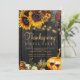 Estilo russo tradicional convite jante de Ação de Graças com lindos girassóis, uvas, uma abóbora de cor d'água laranja, um roteiro de caligrafia em ouro chico e dois copos de vinho tinto sobre fundo de madeira marrom-escura. +++++++++++++ Adequado para a colheita rústica ou vinícola tematizada Festas de Ação de Graças, Ação de Amizade ou reuniões familiares.