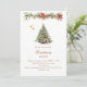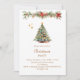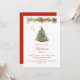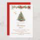 Um convite de inverno para uma festa de Natal. Um fundo branco na frente, decorado com um pinheiro desenhado à mão, de cor aquosa, com ornamentos vermelhos e ouros. Algumas estrelas e uma terra decorada no Natal com cones e flores vermelhas de Poinsettia. Personalize e adicione os detalhes da sua festa. Texto do ouro. Fundo: fundo vermelho. Adicione a url do site ao código QR para RSVP e/ou detalhes da parte.