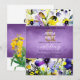 Um convite de casamento sofisticado feito de flores violetas elegantes e amarelas alegres, com escrita à mão requintada,