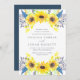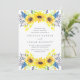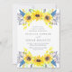 Nosso convite de casamento Flowerfields cerca seus detalhes do dia de casamento com grupos de girassóis de cor amarela, botões azuis e roxos, e folhagem verde. Uma escolha elegante para os casamentos de verão ou outono em ambientes rústicos ao ar livre ou de países.